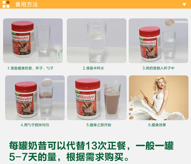 | 特别说明 | 1份减肥代餐奶昔的制备方法是取用33克(约2勺)加250毫升的脱脂牛奶搅拌均匀;需在餐前使用;每天最多使用4份 |