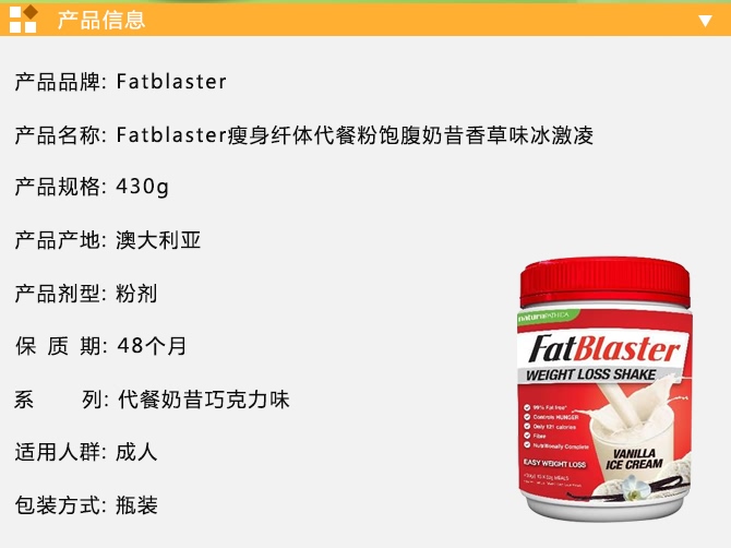 | 产品名 | Fatblaster 纤体瘦身代餐奶昔 香草味 430g |