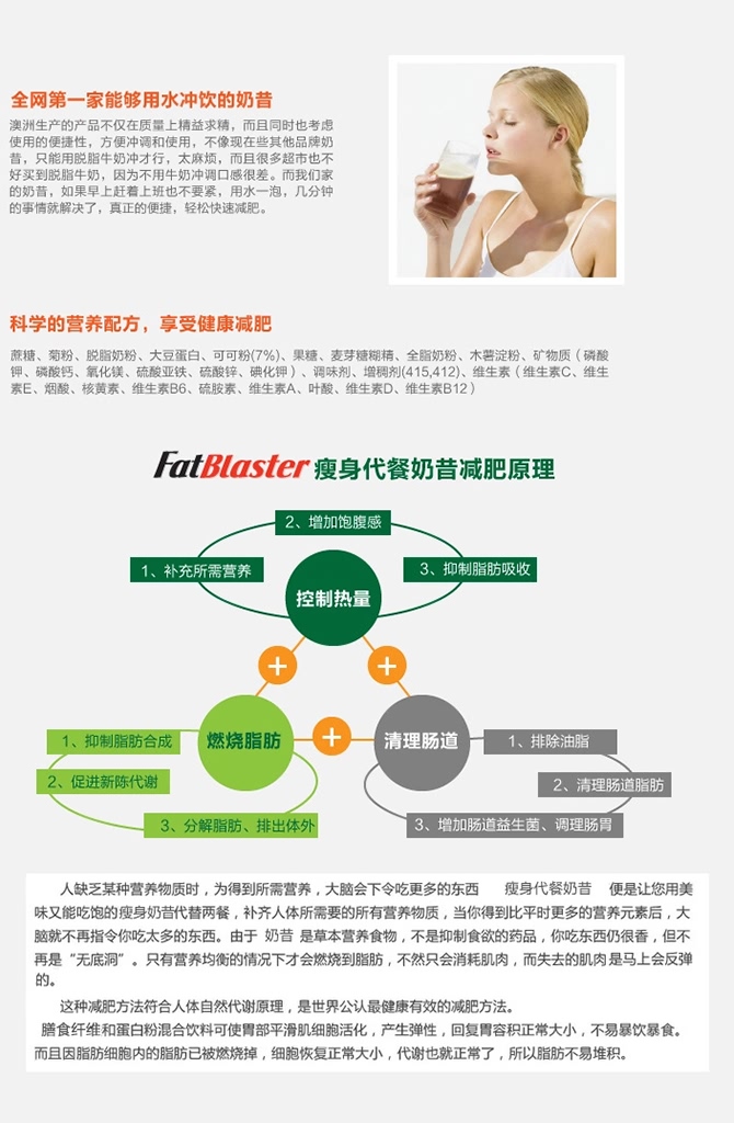 Fatblaster 减肥代餐奶昔非常爽口和营养,富含高蛋白、纤维、维生素和矿物质,帮助人有饱腹的感觉,避免摄入过多的热量和脂肪,同时提供足量的每日营养成分。