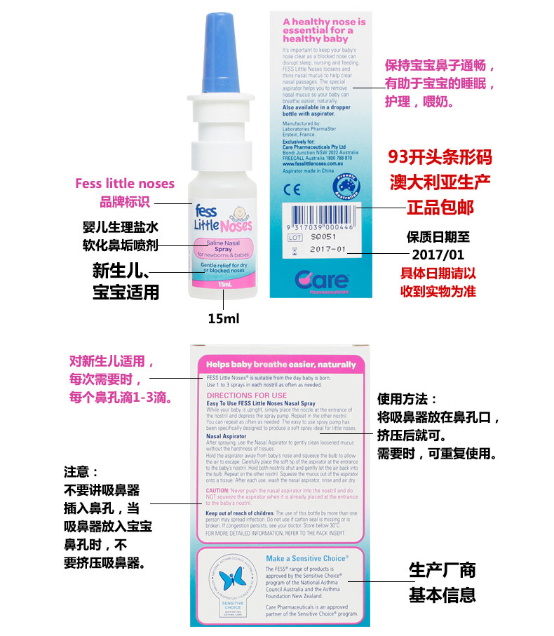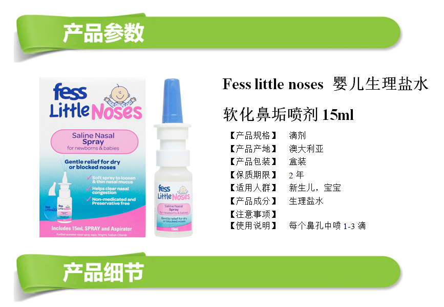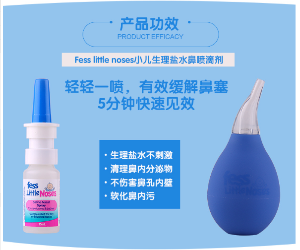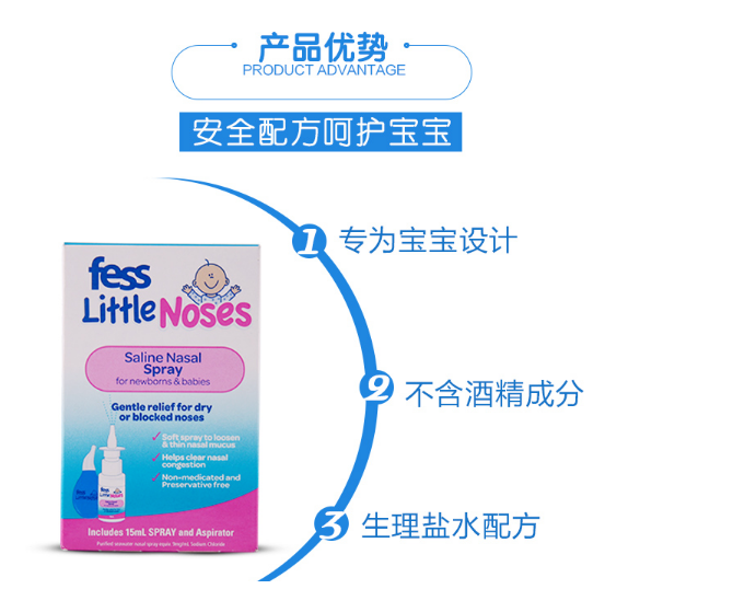 Fess little nose 婴幼儿盐水通鼻喷雾剂+吸鼻器专为宝宝设计。可以即时缓解由于感冒,过敏,窦炎以及气候干燥引起的鼻腔堵塞干燥的症状。不含酒精成分,温和的生理盐水配方不会刺激宝宝娇嫩的鼻腔粘膜,可以随时取用,不用担心有任何副作用。吸鼻器是用胶皮制成,头部非常柔软是专门为小宝宝的鼻腔设计以吸出鼻粘液,更贴心的帮助宝宝吸出堵塞物。