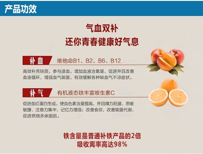 本品为有机液态铁+丰富维生素C 高效补充铁质,参与造成,增加血液含氧量,改善血液循环,有效缓解脸色苍白、易疲劳、手脚冰凉、头晕、头疼、情绪沮丧、脑力不足、免疫力下降等缺铁症状,从源头去除黑眼圈,令脸色红润光泽,精力旺盛。 维他命B1、B2、B6、B12 是大脑神经递质基础营养素,也是中国膳食易缺乏的维生素群。铁元内丰富的维生素B族令思维更加敏捷、集中注意力,增强记忆;改善食欲,改善能量代谢,促进燃烧多余脂肪。