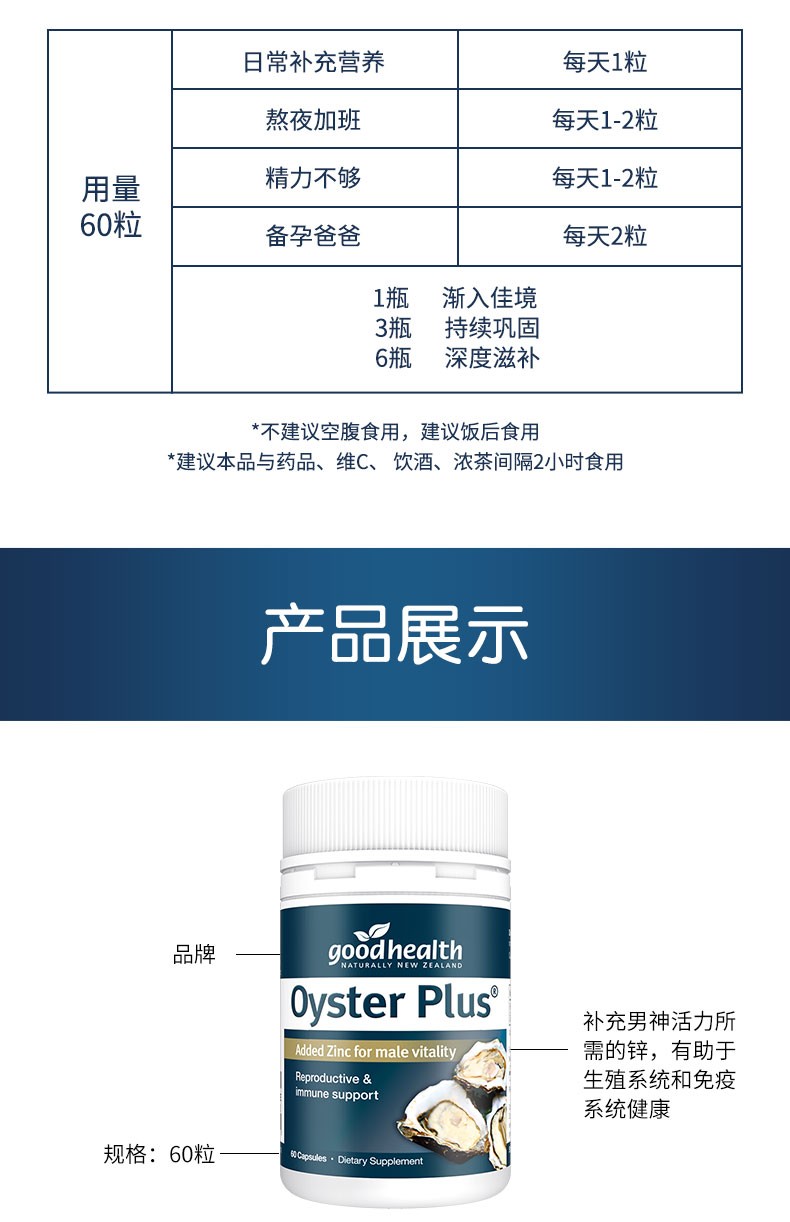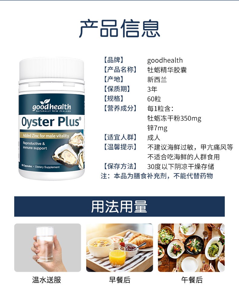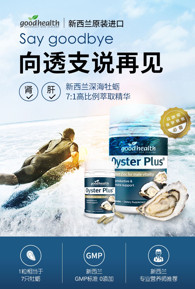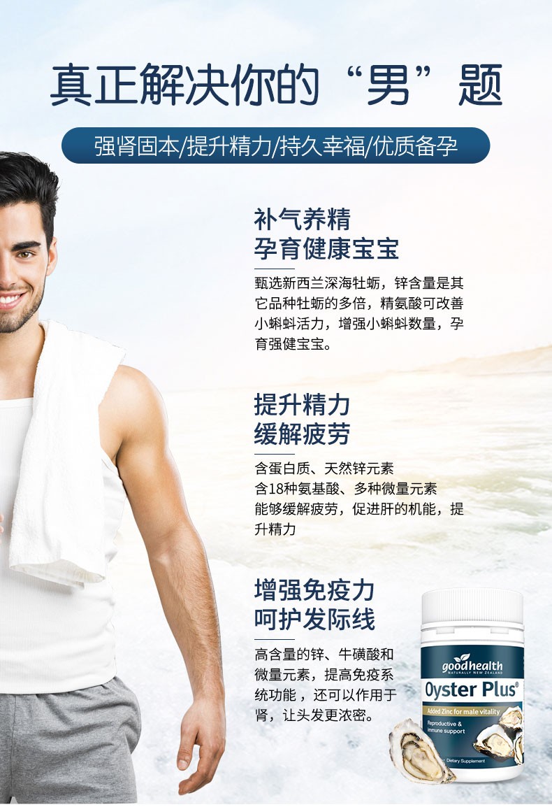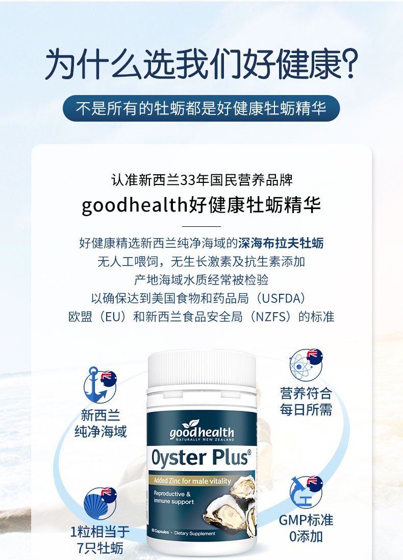【Good health好健康生蚝精】男人的‘充电宝’,唤醒你的超能力!针对男性活力的补品,采自新西兰纯净海域沿岸之新鲜生蚝精粹而成 ,实验室高科技研发,精确配比,有助于强化心血管、肝和肾等正常功能,对增强体力及调节生殖系统和免疫系统有很大帮助 。牡蛎含有丰富的锌及胺基乙磺酸,长久以来更被视为可增强男性性功能及刺激荷尔蒙分泌的佳品。