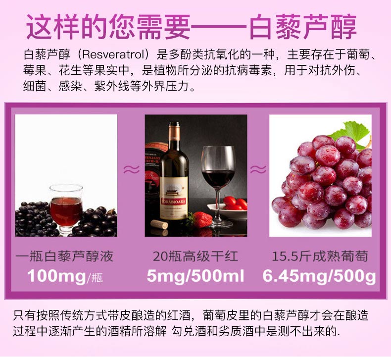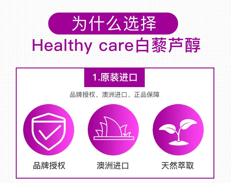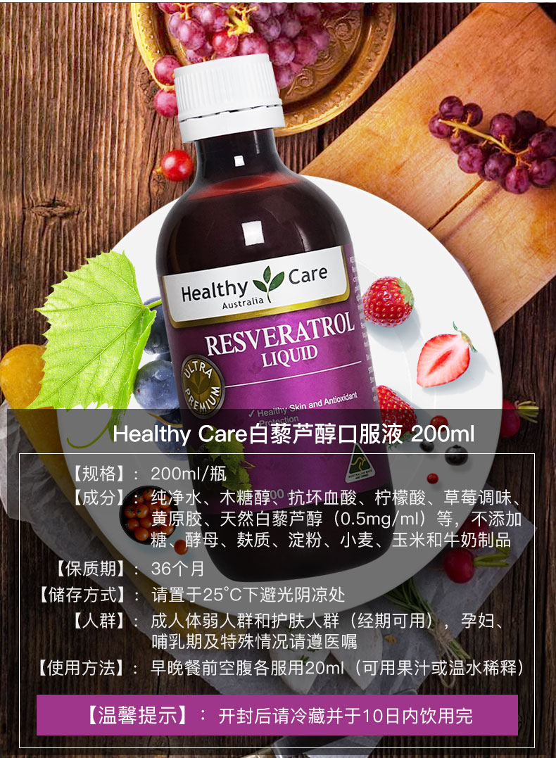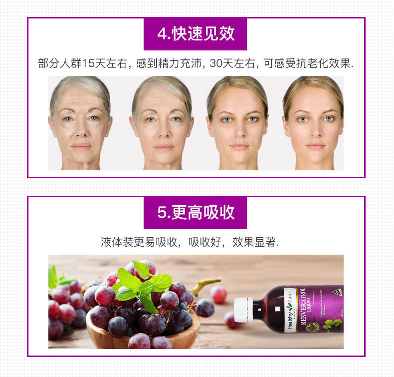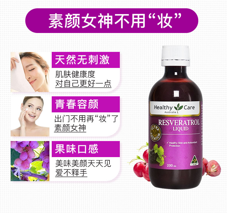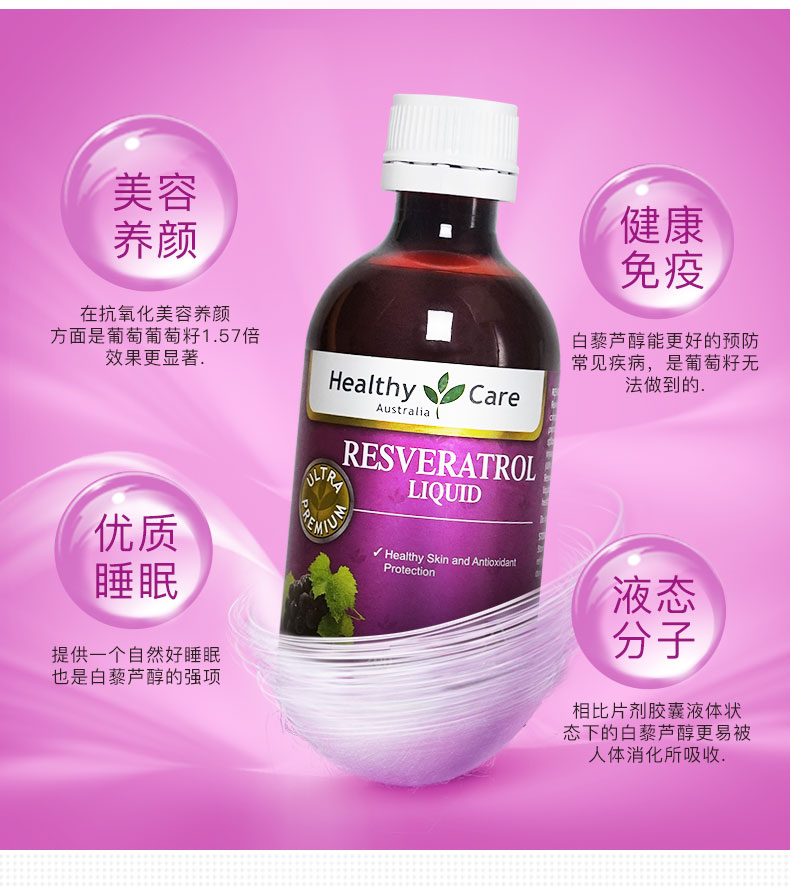 Healthy Care白藜芦醇胶囊和口服液,含有高浓度白藜芦醇活性成分,有缓解压力,有效修复伤口,真菌感染,富含超强抗氧化剂葡萄籽提取花青素和维生素C,美白养颜,对抗自由基伤害,改善心血管功能,促进新陈代谢,给你健壮体魄不老容颜