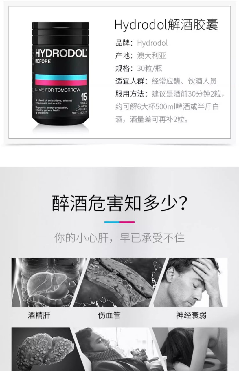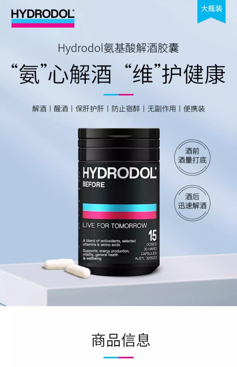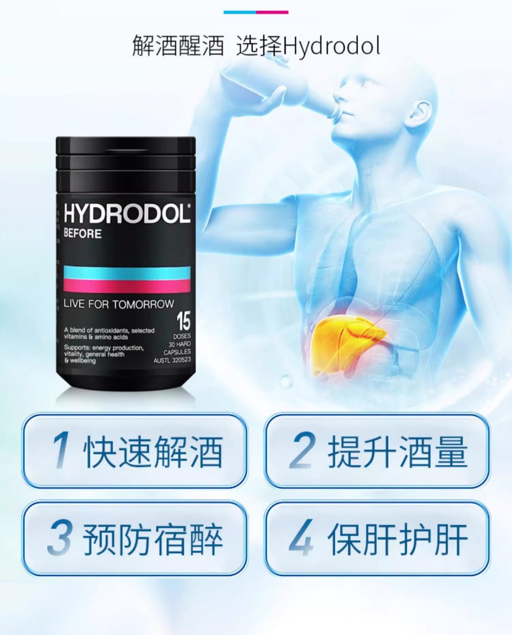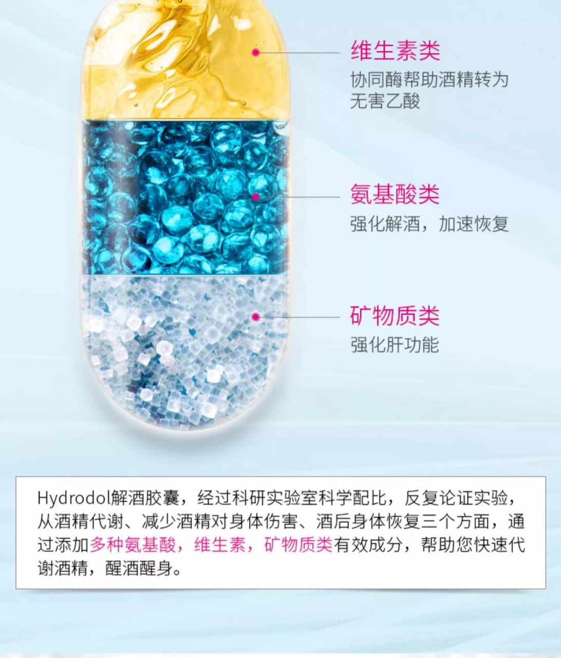 本产品含人体需要的16种氨基酸,6种维他命,2种矿物质,一种中草药提取物和一种抗氧化剂提供全面配方,补充喝酒时身体与酒精抗衡所需要的全面营养!是非常安全的解酒灵药,天然草药提取物和氨基酸维他命呵护肝脏,不再害怕酒精对人体伤害。Hydrodol是派对必备的好帮手,适用于社会活动和集会。最好在饮酒的时候配用。另外,也可以隔天早晨起床后服用Hydrodol。