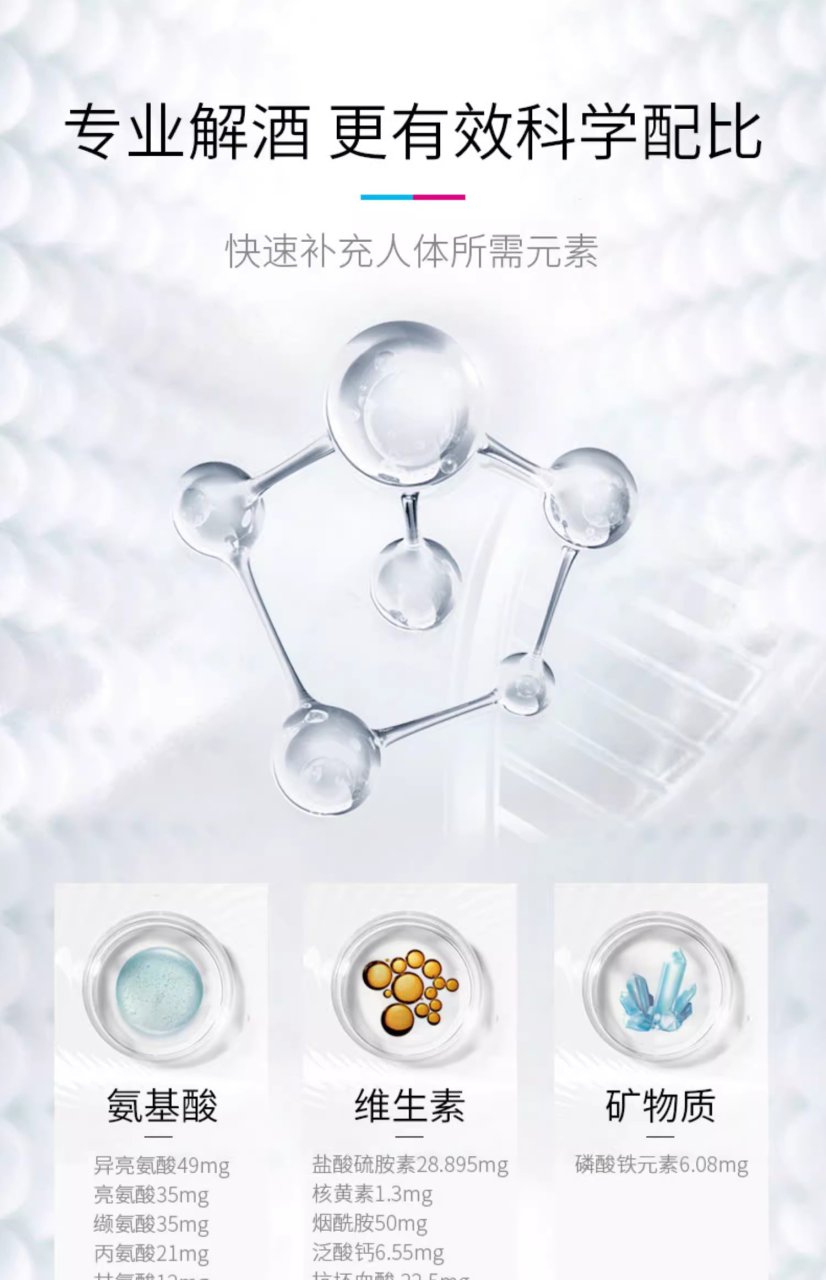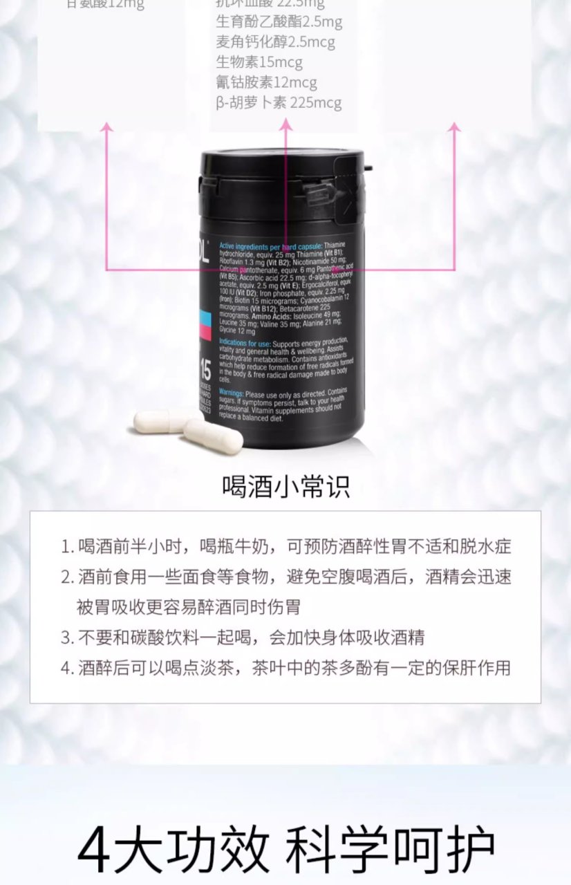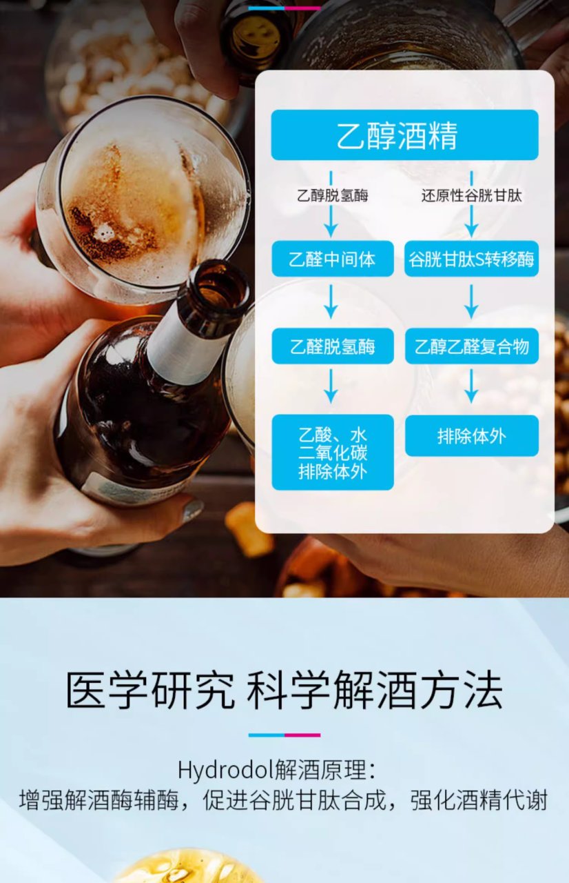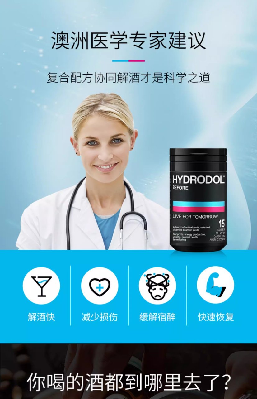 本产品含人体需要的16种氨基酸,6种维他命,2种矿物质,一种中草药提取物和一种抗氧化剂提供全面配方,补充喝酒时身体与酒精抗衡所需要的全面营养!是非常安全的解酒灵药,天然草药提取物和氨基酸维他命呵护肝脏,不再害怕酒精对人体伤害。Hydrodol是派对必备的好帮手,适用于社会活动和集会。最好在饮酒的时候配用。另外,也可以隔天早晨起床后服用Hydrodol。