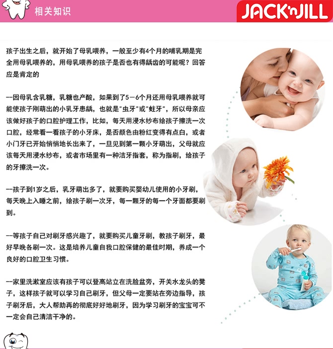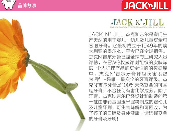| 特别说明 | 1.用最小的压力反复刷牙,配合JACK N JILL同品牌有机牙膏使用效果更佳; 2.每8周或破损初期更换一次牙刷,生病后需更换牙刷; 3.使用前后请彻底冲洗牙刷、勤消毒 4.保持牙刷存放于干燥处 5.需在成人监督下使用,请勿咬或吞咽牙刷 |
