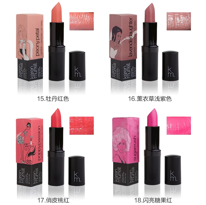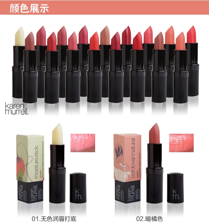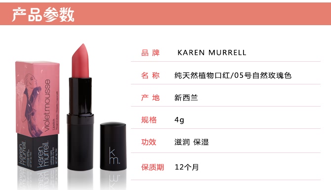 karen Murrell使用来自纯天然的原料制作这款口红,产品中不含任何的矿物油,不使用从动物身上提炼的材料,不使用防腐剂。有机的天然成分使口红散发着自然而柔和的香味,并有效滋润唇部肌肤,高质量的制作工艺使这款口红具有较好的显色度及持久性。