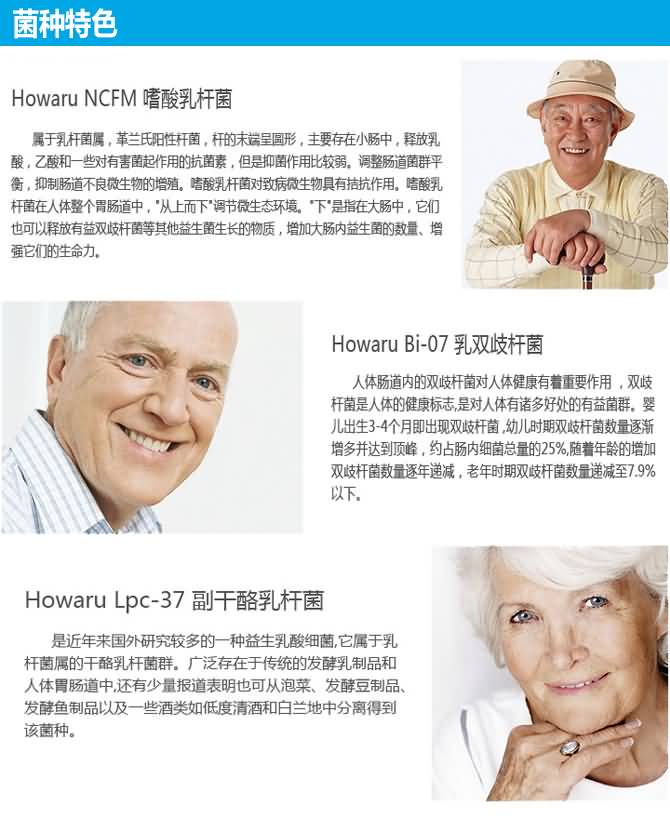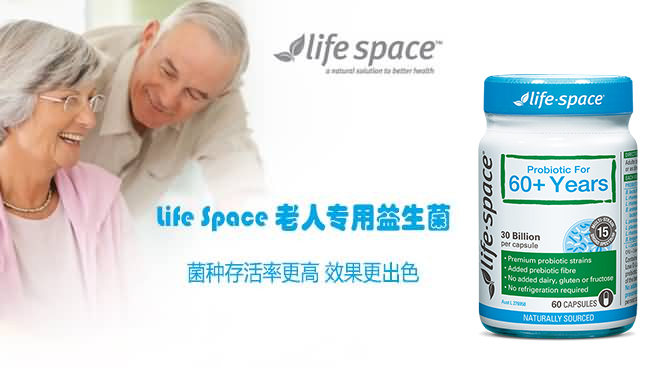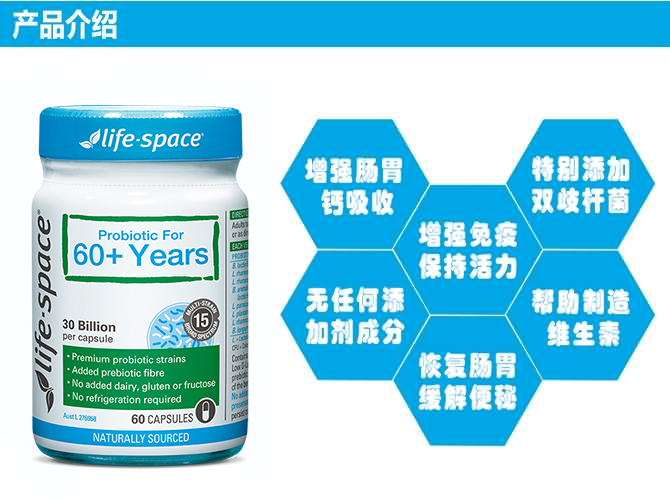 从60岁以后,人体消化系统中的一个重要有益细菌——双歧杆菌,在不断减少,从而造成了肠功能紊乱。Life Space根据这一特点, 研发了一款针对60岁以上中老年人的益生菌,其中不仅添加了大量的双歧杆菌,帮助恢复肠胃功能,缓解便秘,同时还加入了其他多种益生菌,帮助身体更好的制造维生素K和D,增强肠胃对钙的吸收,有效地防止骨质疏松等症状。针对60岁以上人群特别添加了大量的双歧杆菌(人身体中的双歧杆菌在60岁以后会急剧下降) 产品所含益生菌可在高达90度高温下正常存活,不用冷藏 本产品经过多年科学研究特别挑选了