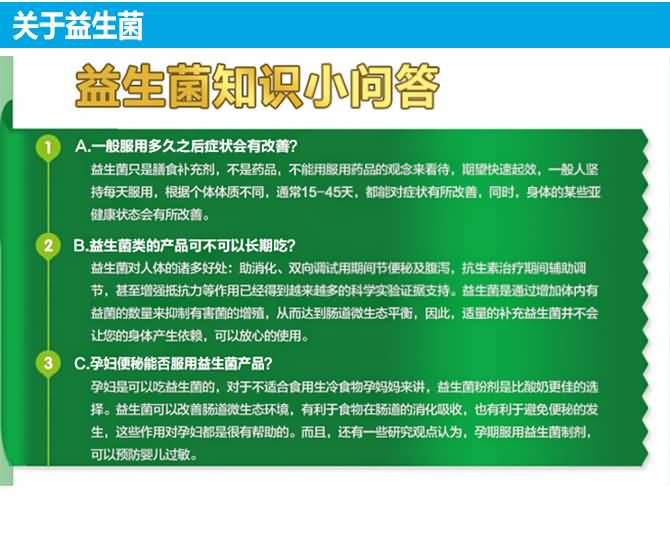 | 特别说明 | 正常调理:每日一次,一次一粒 缓解便秘:每日一次,一次两粒 服用抗生素及放疗期间:每日一次,一次两粒 (与抗生素分开至少两小时服用) |