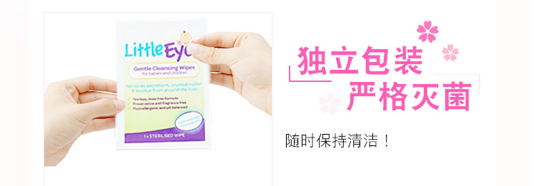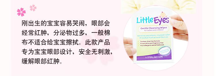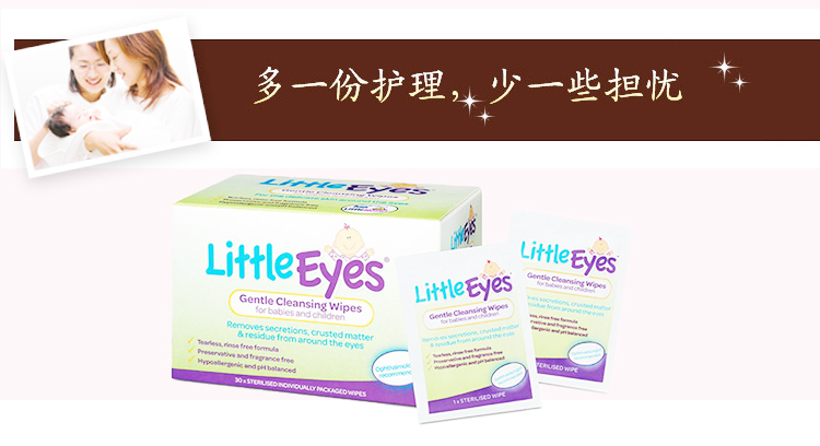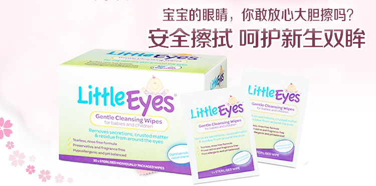 Little Eyes 专业婴儿擦眼口清洁湿巾 30片装(无刺激) LITTLE EYES是澳洲本土专业做儿童擦拭湿巾的品牌,品牌历史悠久深受澳洲本土妈妈们的欢迎。本产品是为婴儿设计的清洁湿 巾,可以去除宝宝分 泌物,及各种宝宝眼部附近的脏物。本品采用无泪及柔软配方,不伤害宝宝稚嫩肌肤,尤其是眼部周围脆弱肌肤。