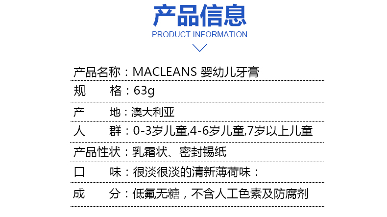 Macleans 低氟儿童牙膏(防蛀牙)专为婴幼儿设计,质地柔软,非常温和,有助于保护幼儿乳牙的釉质,帮助预防龋齿。这款白色的牙膏富含氟和钙等物质,能很好的保护宝宝的乳牙。低含量的氟有利于孩子牙齿的健康,其不含糖,能够有效防止蛀牙,清洁牙齿。本产品带有淡淡的清新薄荷味,令口腔更加清新,让宝宝们爱上刷牙。