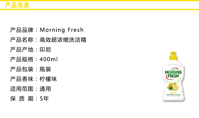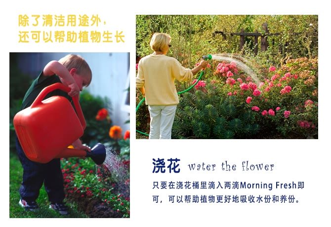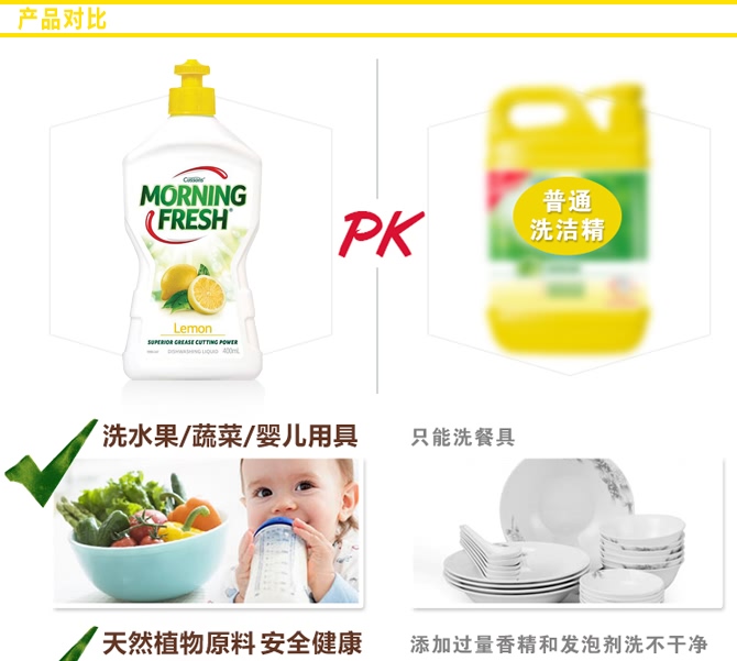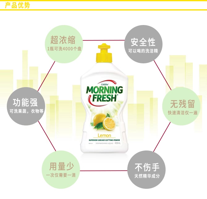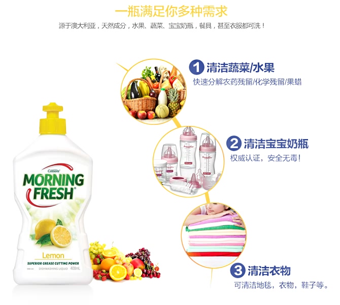 MORNING FRESH餐洗净它可以有效的清洁果蔬、餐具表面的油污细菌和残留农药,经严格皮肤测试、安全护手。此外还可以清洗衣物,在浇花时滴入水桶,可以帮助植物更好吸收水分和养分。包装快速自动生物降解,环保。超级赞哦!适合家庭用于清洁果蔬、餐具表面的油污细菌和残留农药,经严格皮肤测试、安全护手,每天洗我们盛食物的碗盘的洗洁精,必须要无毒,必须要安全!