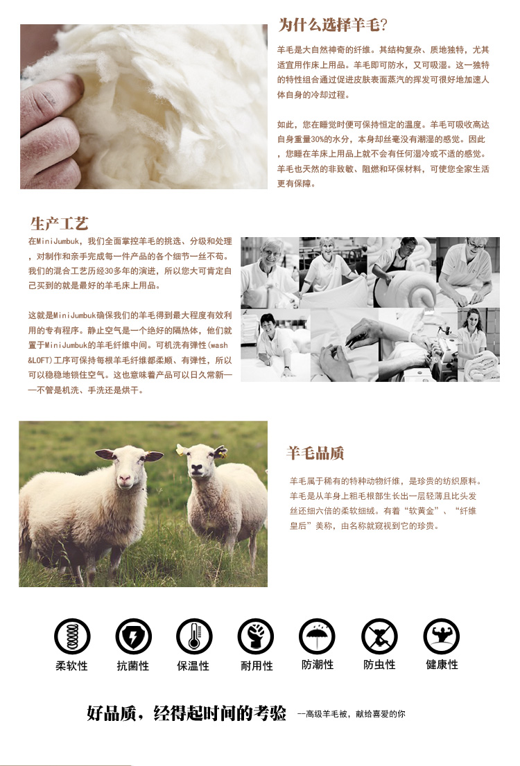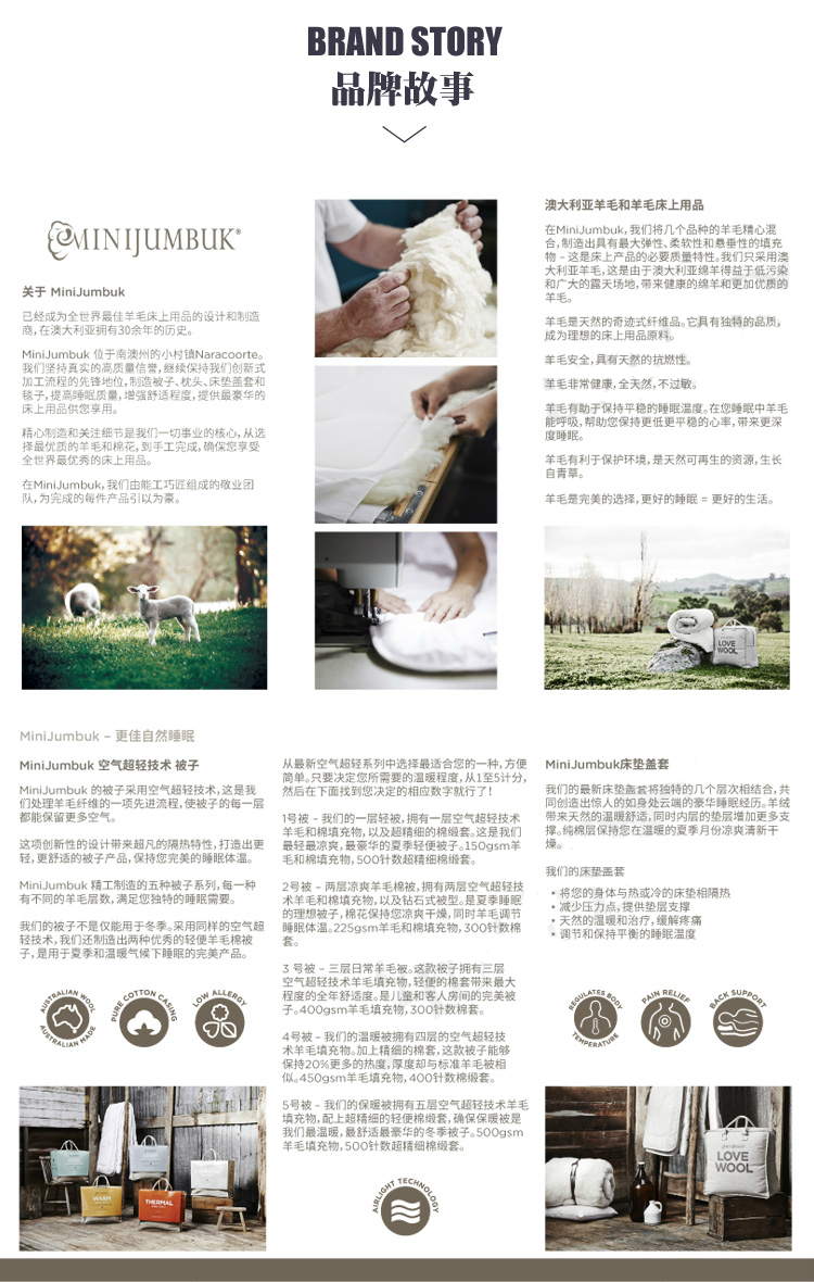 MINI JUMBUK是澳洲顶级羊毛被褥品牌,此品牌用料考究,质量上乘,产品全部用澳洲本地纯小羊羔羊毛,在澳大利亚本土加工制做,是名副其实的Australian Made,是首推的送礼、送家人最好产品。这个儿童系列,是专门为孩子们设计的,透气、防过敏,澳洲唯一官方认可哮喘患者可用产品。