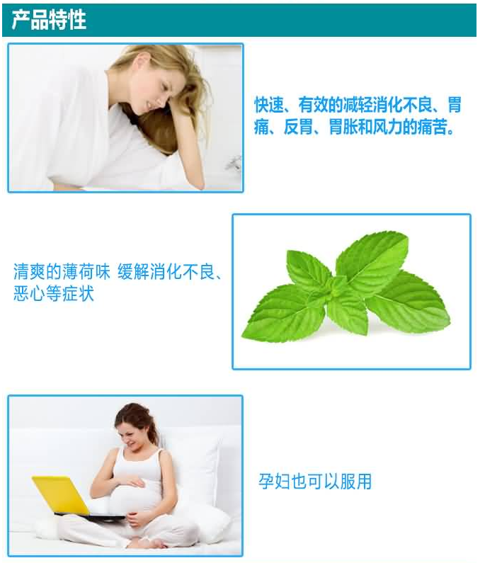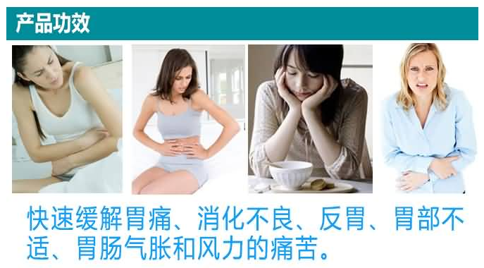 | 功效 | 快速缓解胃痛、消化不良、反胃、胃部不适、胃肠气胀和风力的痛苦。 |