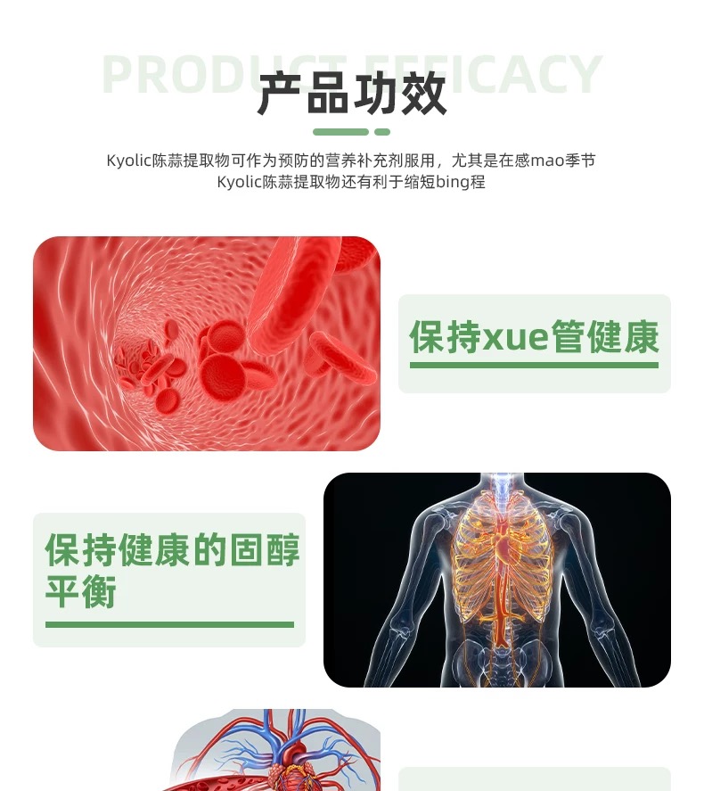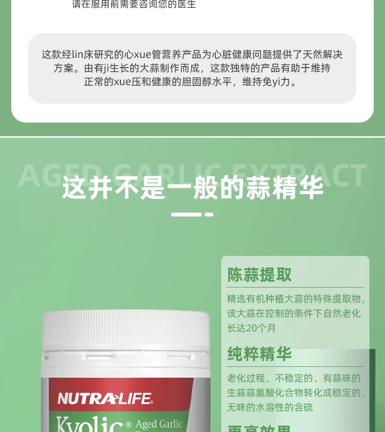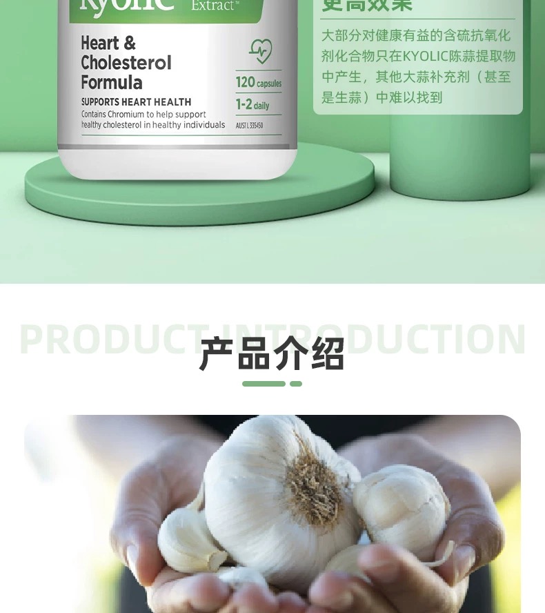 Kyolic®心脏和胆固醇配方将专有的陈年大蒜提取物™与硫胺素和铬结合在一起。Kyolic®陈年大蒜提取物™是长达20个月的专有陈年过程的结果,它将有机种植大蒜中的天然硫化合物转化为一系列有益的、水溶性的、无味的化合物。硫胺素支持心脏健康,铬有助于支持健康个体的健康胆固醇。