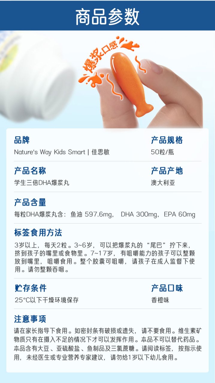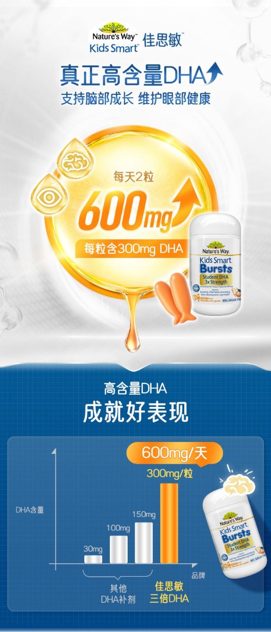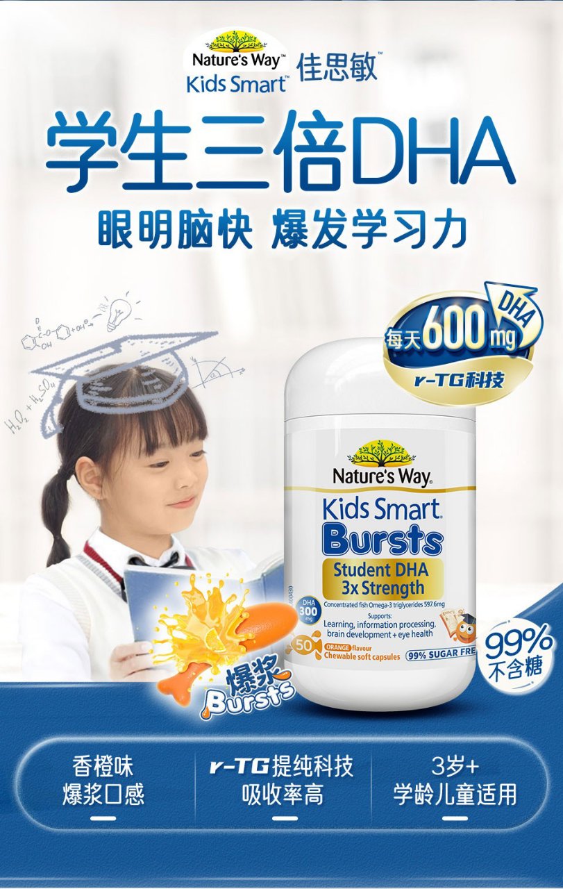 *不用的条目*Nature’s Way 佳思敏学生儿童眼脑黄金3倍DHA鱼油胶囊橙子味 50粒 增强学习记忆力3岁+