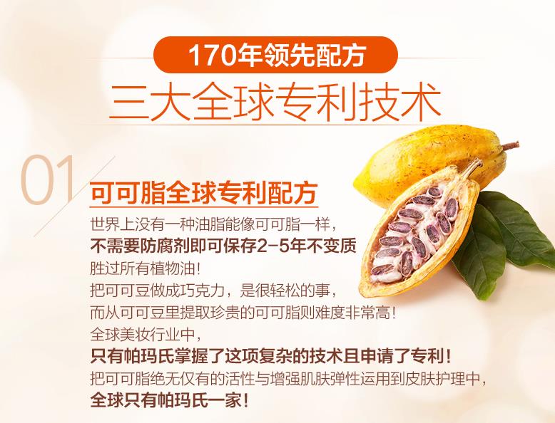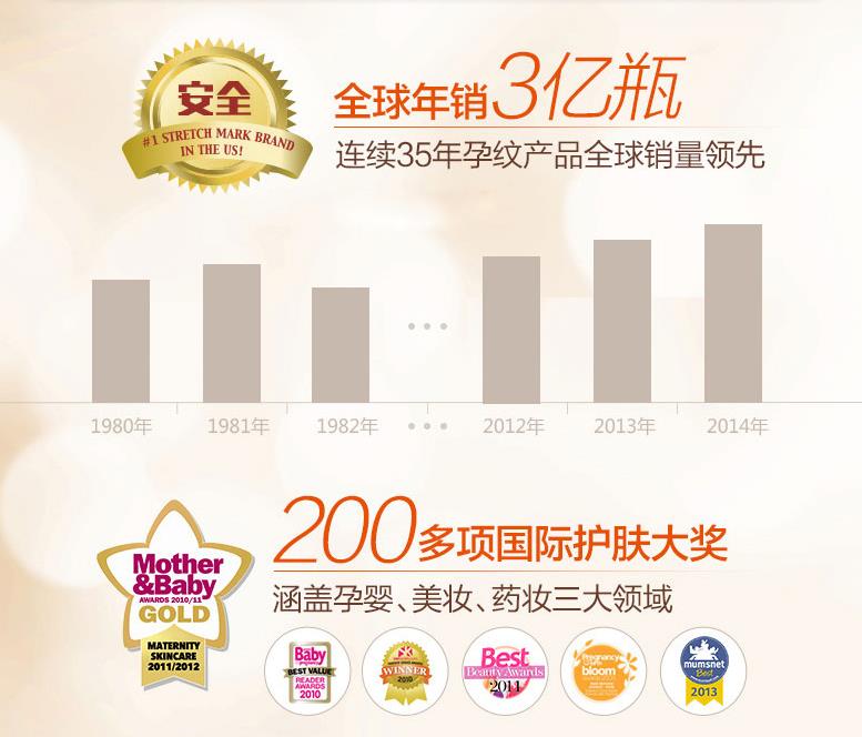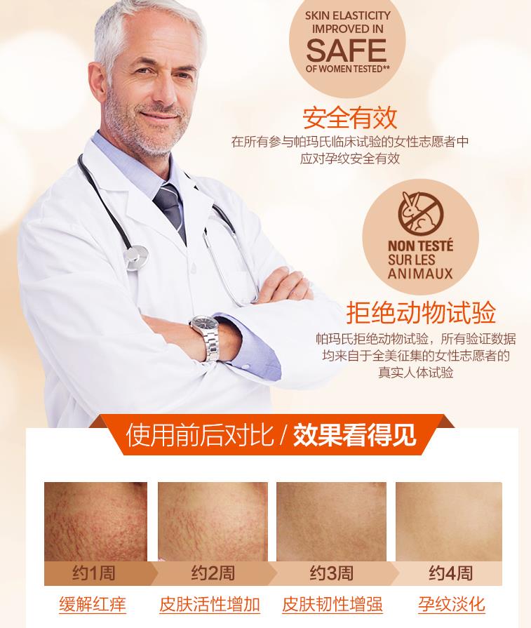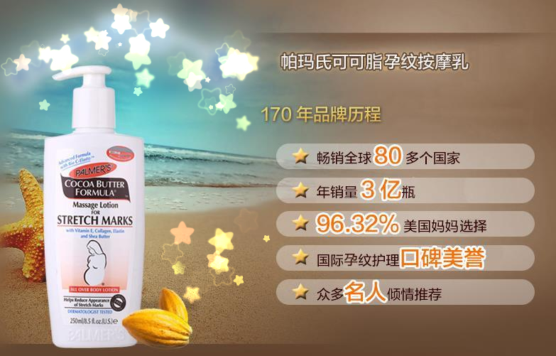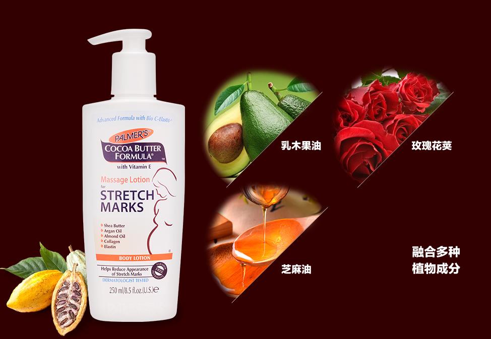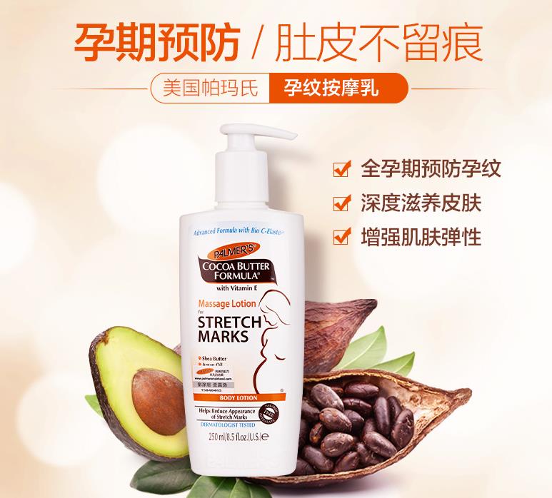 Palmer's帕玛氏雅儿妊娠纹按摩修复乳能有效防止和减少妊娠纹的产生。本产品还有可可脂、维他命E、胶原蛋白、弹性蛋白和牛油树脂。这些成分使皮肤润滑同时帮助皮肤保持弹性和水润。特有的压泵式包装能使您方便涂抹手臂、大腿、胸部、腹部和臀部。本产品经临床和皮肤测试。