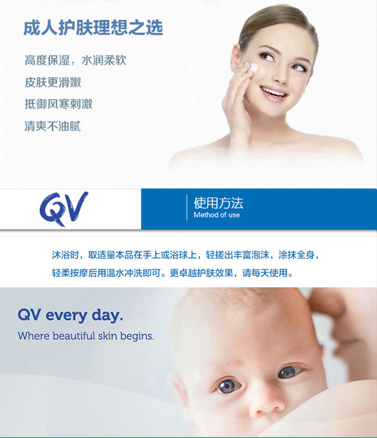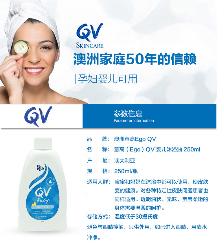 Ego QV 婴儿沐浴油专为宝宝日常清洁而研制,适用于宝宝日常使用,从宝宝出生的第一天开始呵护宝宝肌肤,乳状无泡沫。轻柔、彻底的洁净面部和尿布区域,使宝宝皮肤不干燥。富含滋养和舒缓的植物油,保持宝宝皮肤水润,柔滑水嫩,是妈妈放心的不二选择。