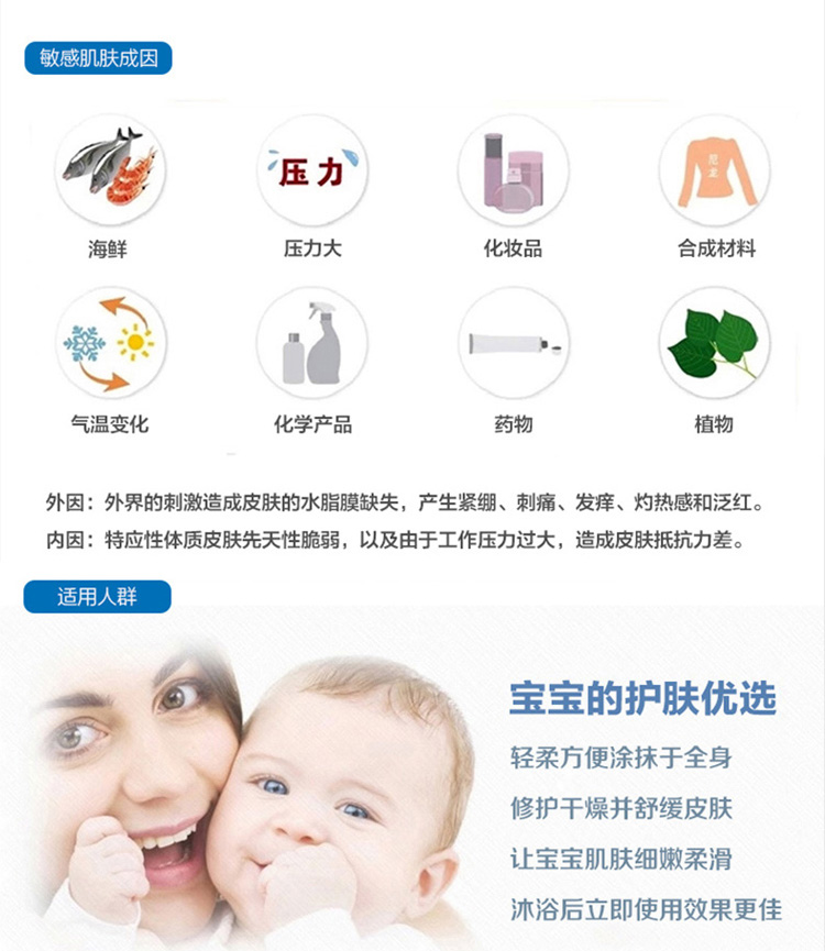 3、乳液质地,使用后宝宝的皮肤滋润光滑,有效预防各种湿疹、皮炎、细菌感染。