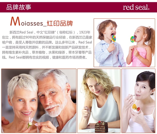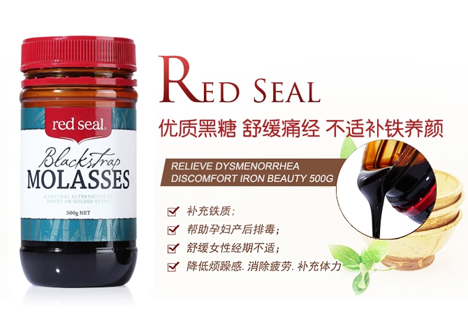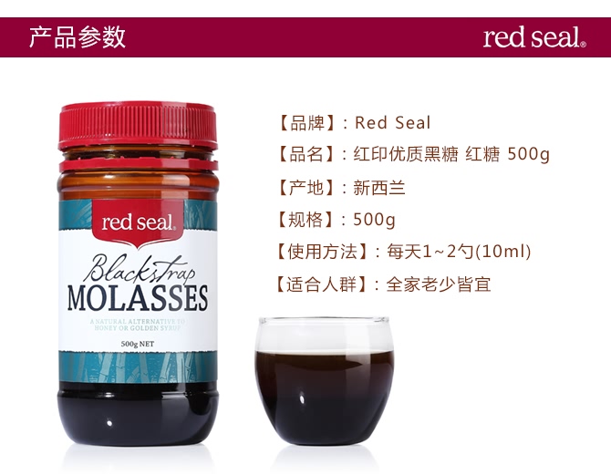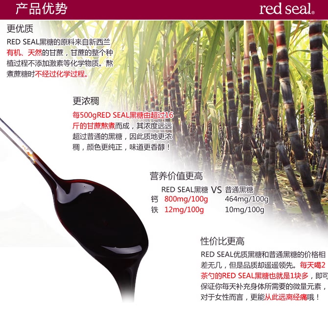 Red Seal Molasses优质黑糖是最厚、最纯的,营养种类最丰富繁多的蔗糖。每次服用的黑蔗糖包含了‘每日建议食用矿物质’RDI 的30%量。 其中富含含有3.7mg的铁,同时含有铜、镁、磷、钾,叶酸和维他命B2,B3,B6。 女性必备品,效果要比普通红糖好很多,不含糖精、口感不同于普通红糖,带一点甘苦味,可以暖宫活血化瘀,补铁养颜,对舒缓痛经,女生手脚冰冷效果显著,尤其适用于月经期,产后排毒月子期。黑糖对女人真的很好哟,补血补铁,改善经期症候群。