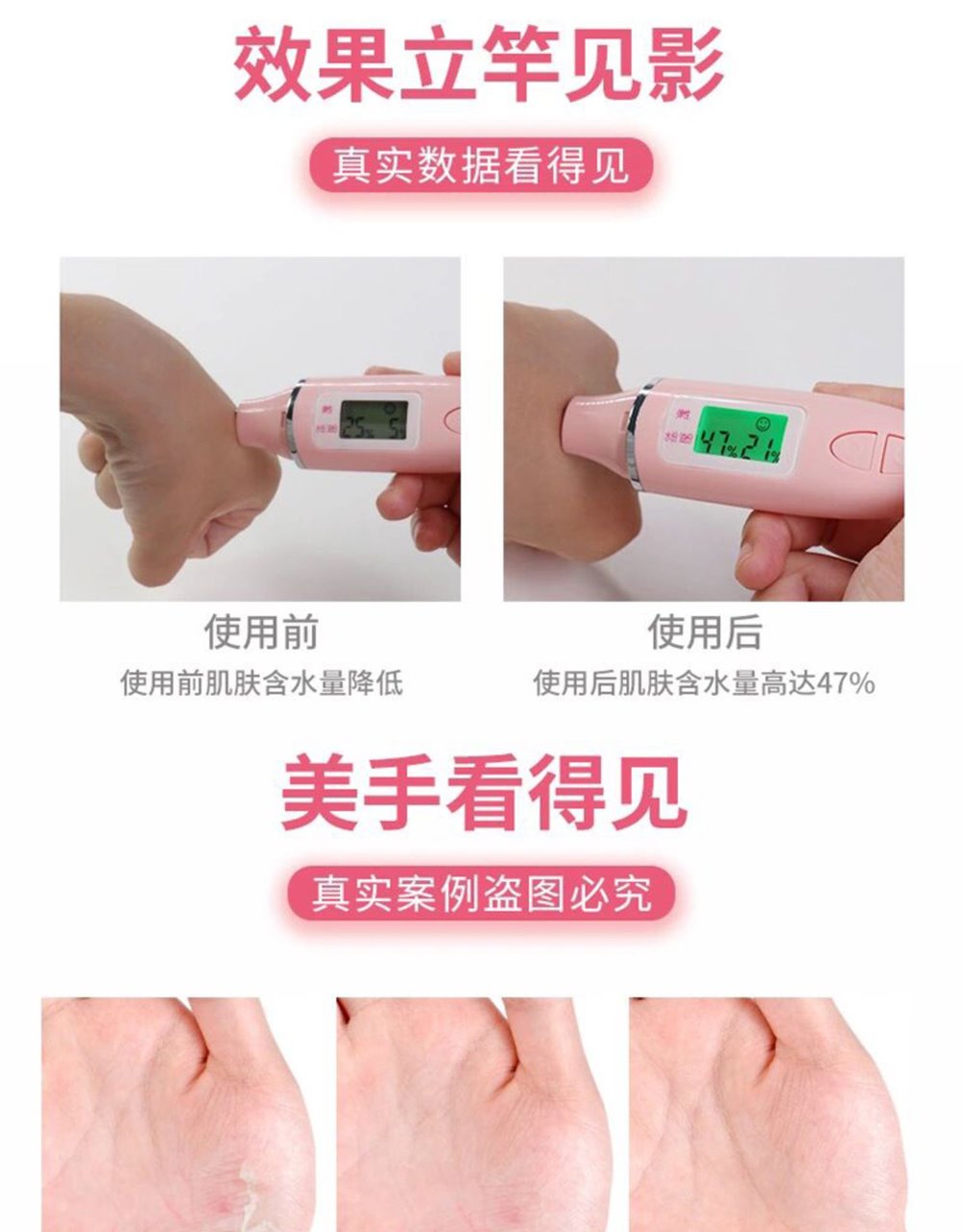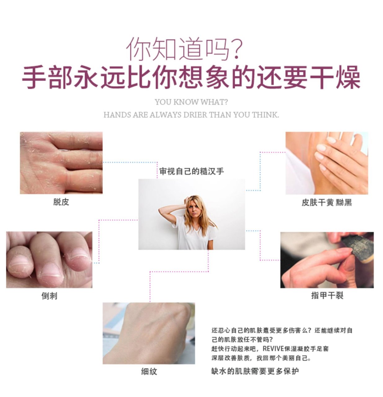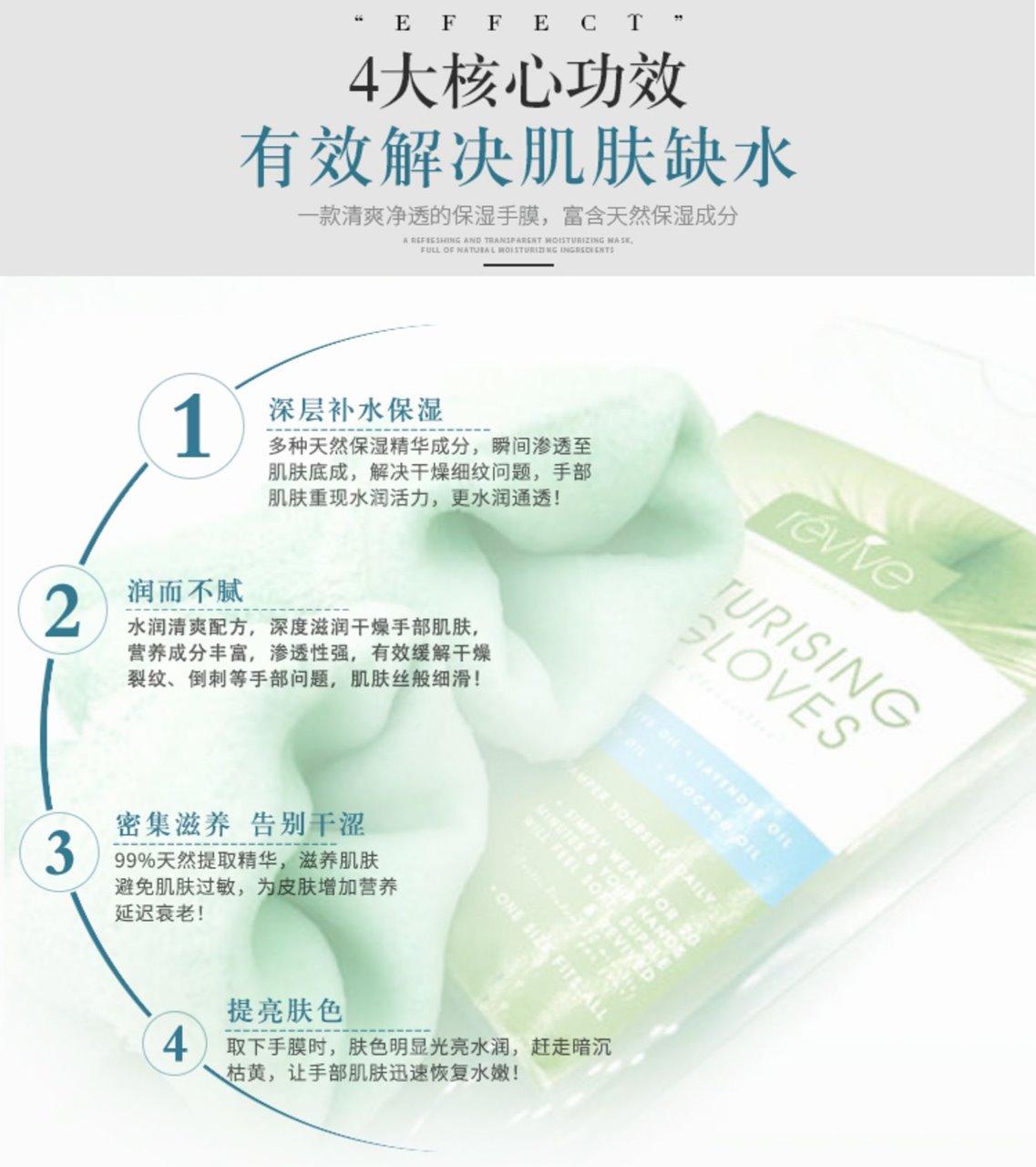 本产品每次可以使用20分,调理手部肌肤,深深滋润皮肤。含有霍霍巴油,橄榄油,维生素E和薰衣草油。保湿补水,滋润保养,适合干燥肌肤。让你的双手会感觉更柔软,更滋润。可触屏哦~ Revive 玫瑰果精油美白抗皱手套 可触屏 手膜 祛皱 去皱纹