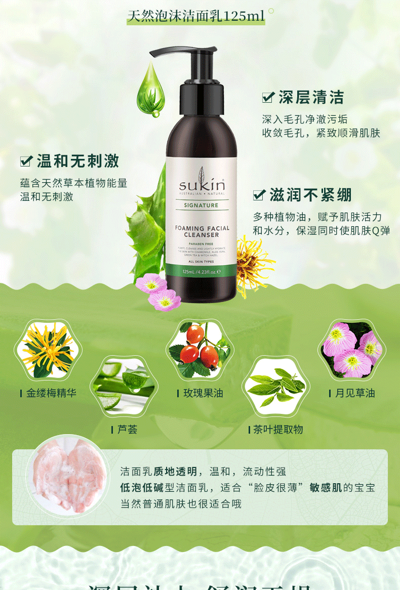 Sukin 苏芊 天然泡沫洁面乳 125ml:即可以清洁皮肤表面污垢,又可以清除面部彩妆,清净同时滋润皮肤。富含黄春菊、玫瑰水、吉拉索芦荟、绿茶、月见草油和金缕梅等,使皮肤柔嫩,没有油性的残留物,适合所有肌肤,特别是油性和混合性肌肤。