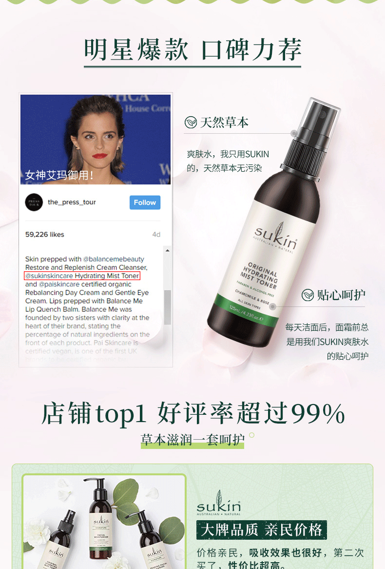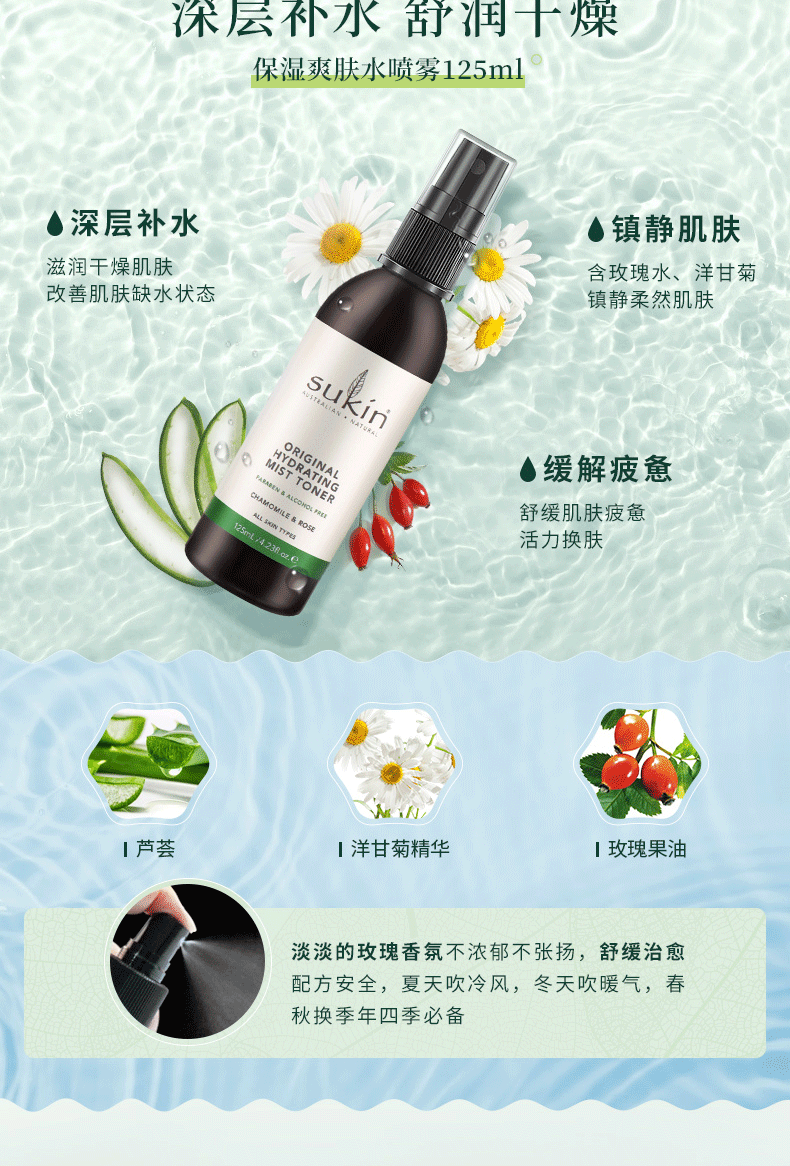 ○ Sukin 苏芊 保湿喷雾爽肤水 125ml:以天然纯正的玫瑰水和黄春菊为主要材料,不含洒精,温和清爽,具有超强保湿功能,令疲劳肌肤更镇定舒缓,更亮泽,让您容颜保持清新、健康状态。感觉皮肤干燥或紧绷时,随手一喷,立刻带来清爽、水水的感觉。玫瑰爽肤水喷雾是干燥季节或干燥地区爱美人士的恩物,也是长期呆在空调写字楼中白领们的至爱。淡淡的玫瑰香不仅带来清爽好肌肤,也带来甜美笑容,很多爱美MM飞行途中也会使用,将保湿做到每一处。