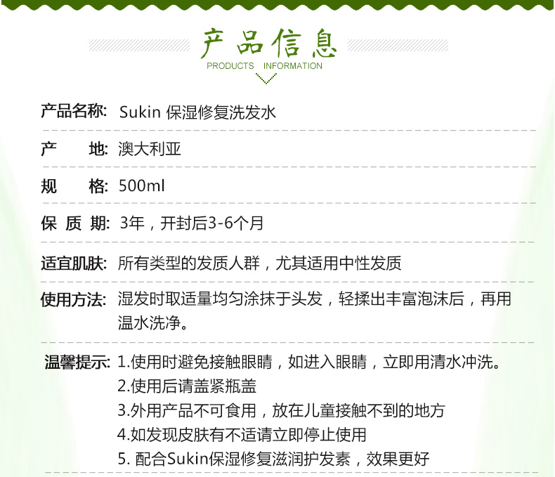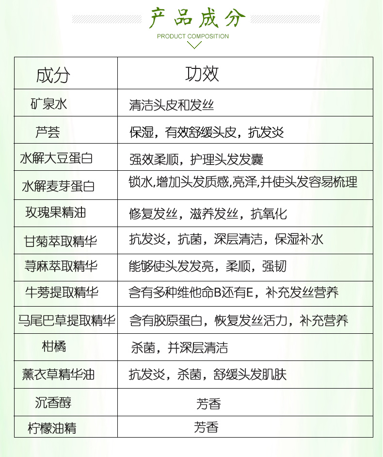 本产品可以深层清洁、滋养修复受损发质,是秀发更营养柔顺,易于打理,富有光泽有弹性。温和清爽净化,是秀发柔顺、健康。含芦荟,荨麻,马尾和牛蒡,可强化发丝,滋润保护头发,增强发质。
