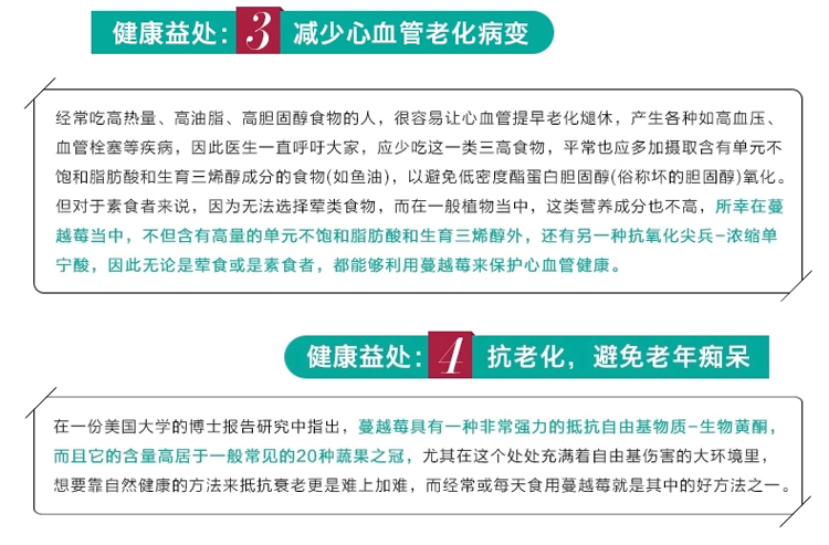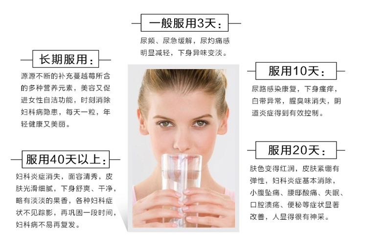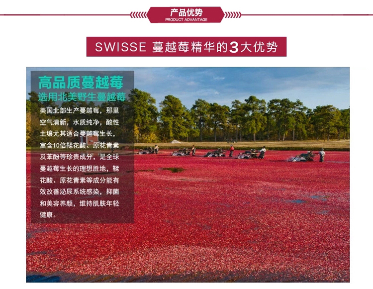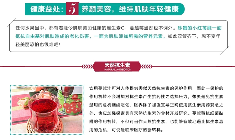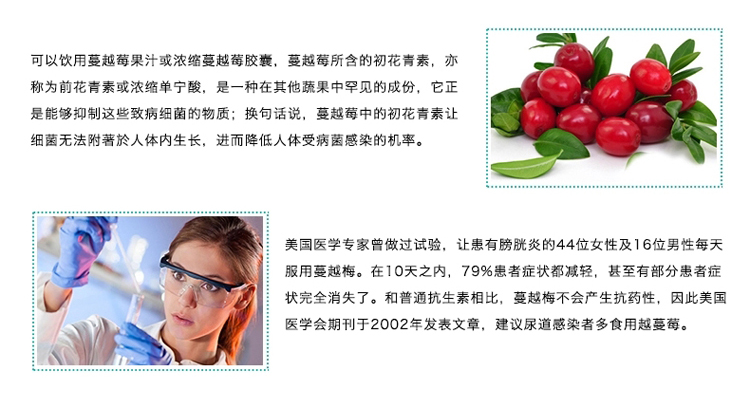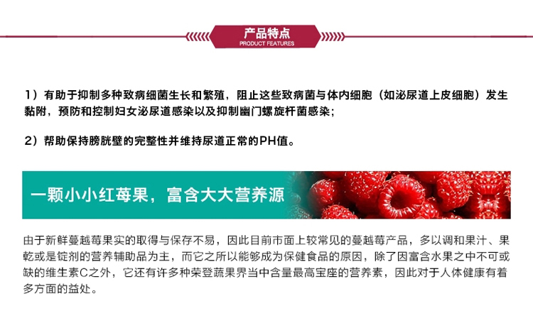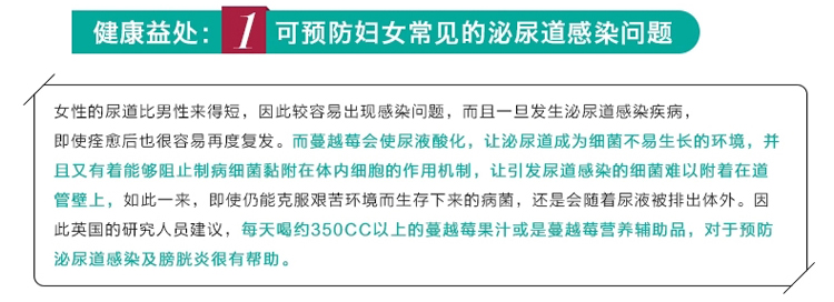 本产品含有的蔓越莓成分可以预防妇女常见的泌尿道感染问题,蔓越莓会使尿液酸化,让泌尿道成为细菌不易生长的环境,并且又有着能够阻止病细菌粘附在体内的细胞的作用机制。有效抑制细菌粘附在胃中,降低胃溃疡以及胃癌的发生率。蔓越莓中不但含有高含量的单元不饱和脂肪酸和生育三烯醇,还有另一种抗氧化剂-浓缩单宁酸,保护心血管健康,减少心血管老化病变。蔓越莓具有一种非常强力的抵抗自由基物质-生物黄酮,可以抗老化,避免老年痴呆。含有的维生素C可以美容养颜,维持肌肤年轻健康。