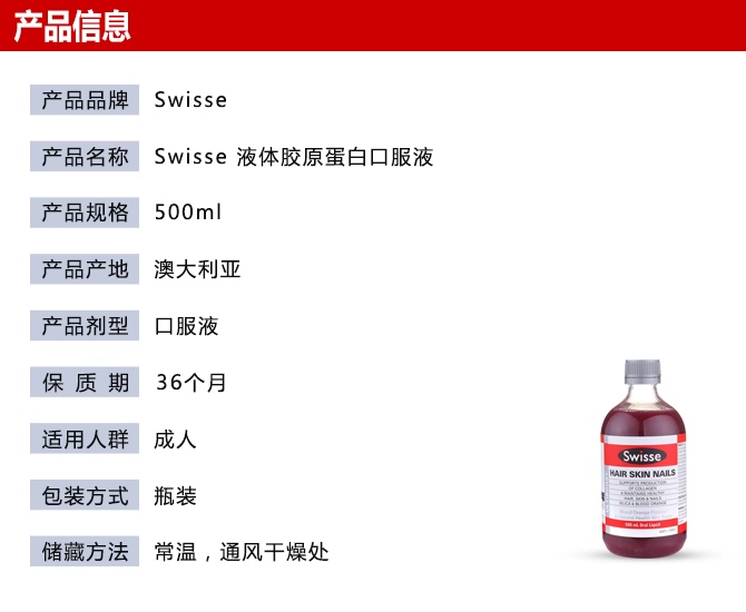 | 产品名 | Swisse 瑞思 液体胶原蛋白口服液 美白抗衰老 500ml |
