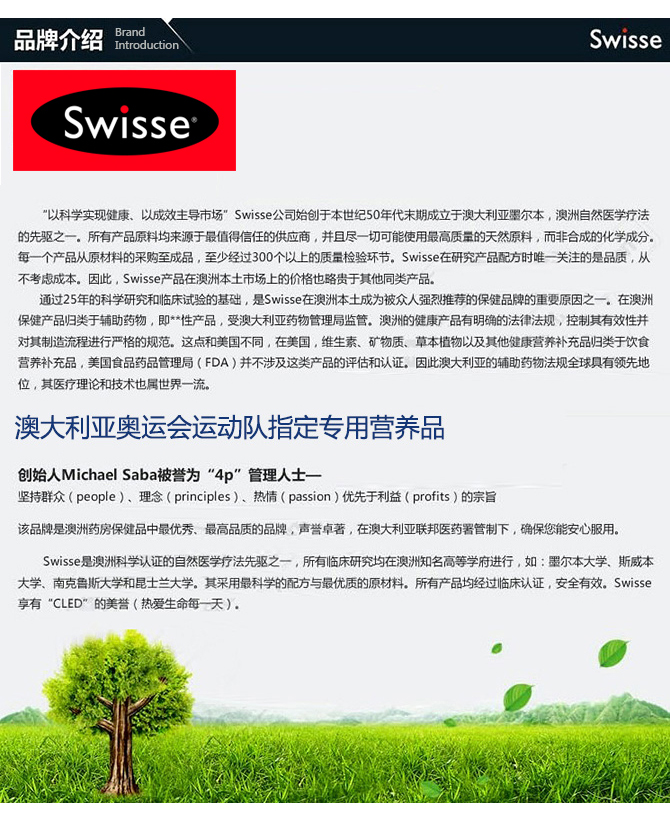 “以科学实现健康,以成效主导市场”Swisse公司始创于本世纪50年代末成立于澳大利亚墨尔本,澳洲自然医学疗法的先驱之一。所有产品原料均来源于最值得信任的供应商,并且尽一切可能使用最高质量的天然原料,而非合成的化学成分。每一个产品从原料的采购至成品,至少经过300个以上的质量检验环节。Swisse在研究产品配方时唯一关注的是品质,从不考虑成本。因此,Swisse产品在澳洲本土市场上的价格也略贵于其他同类产品。