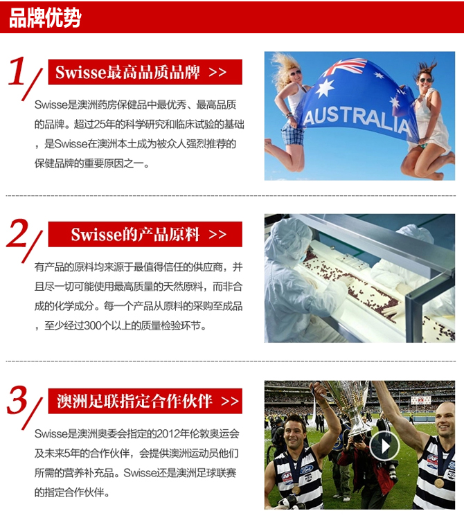 “以科学实现健康,以成效主导市场”Swisse公司始创于本世纪50年代末成立于澳大利亚墨尔本,澳洲自然医学疗法的先驱之一。所有产品原料均来源于最值得信任的供应商,并且尽一切可能使用最高质量的天然原料,而非合成的化学成分。每一个产品从原料的采购至成品,至少经过300个以上的质量检验环节。Swisse在研究产品配方时唯一关注的是品质,从不考虑成本。因此,Swisse产品在澳洲本土市场上的价格也略贵于其他同类产品。