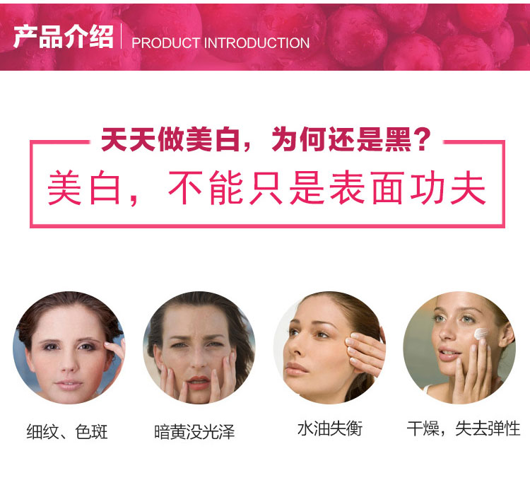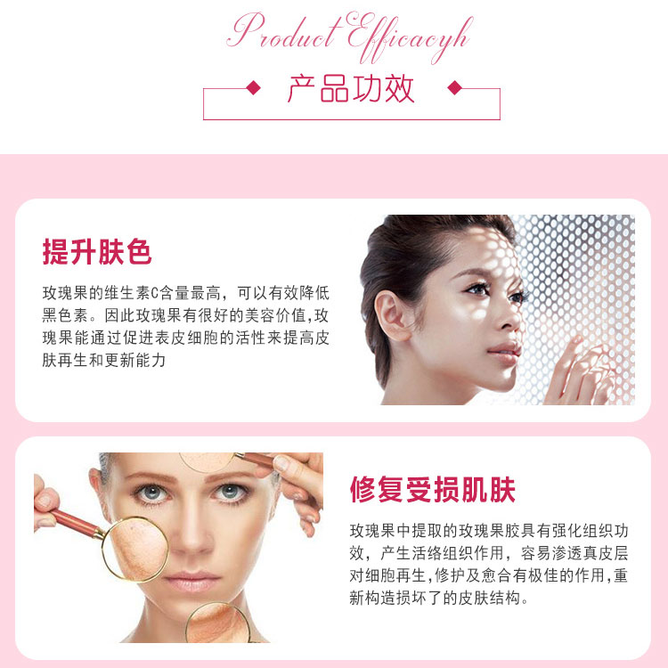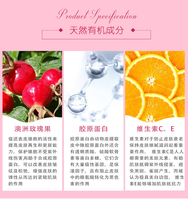 含有丰富的维他命C、维生素E、低聚果糖及多种高级不饱和脂肪酸,起到强大的修复皮肤,抗衰老功能,改善肤质,增强皮肤弹性。