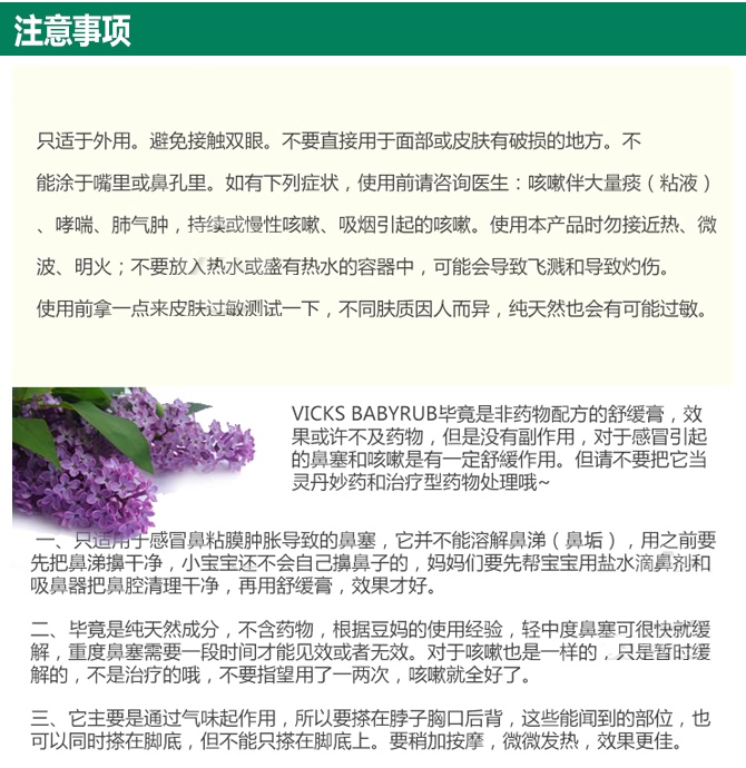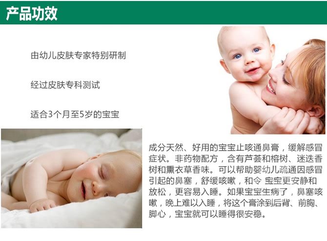著名的Vicks特殊配方舒缓软膏,专为婴儿设计,不含药物;3个月以上婴幼儿适用。成分包含桉树精油、芦荟、迷迭香和薰衣草芳香与你的抚触完美的相结合,给宝宝平静。安抚放松你的宝宝,让其更容易入睡。温柔的配方凡士林和芦荟让你宝宝的肌肤倍加柔软。