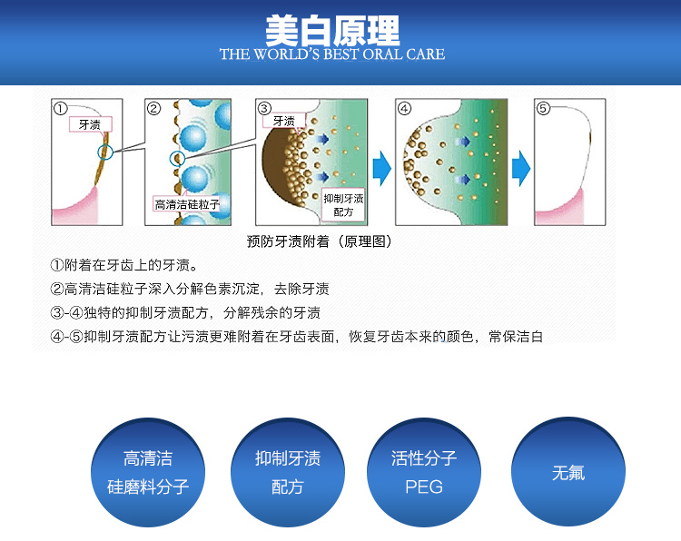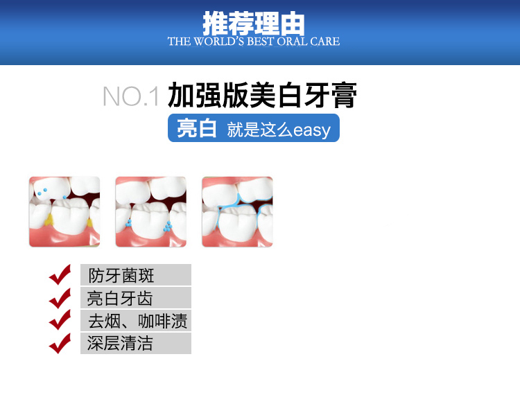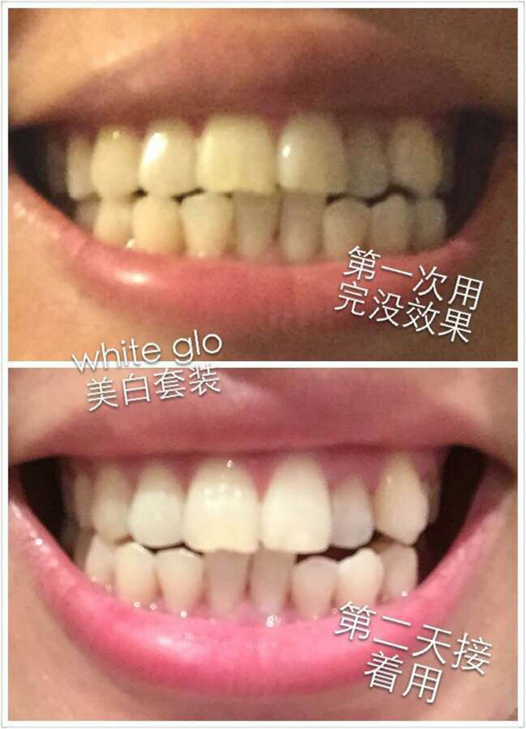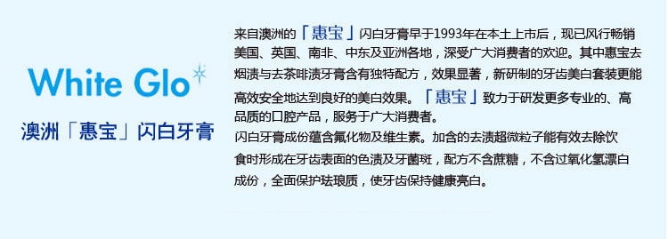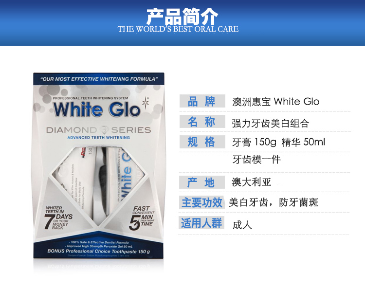 本产品包含美白牙膏150g 、牙齿美白精华50ML、牙齿模一套,有效美白牙齿。美白牙膏150g:配方不含糖,不含过氧化氢漂白成分,全面保护珐琅质。防牙菌斑,配方含去渍超微粒子及漱口水成份,能有效去除牙齿表面的色渍及牙菌斑,使牙齿恢复亮白,同时更能有效去除口气,保持口腔清新舒爽。牙齿美白精华50ML:牙齿美白精华能有效去除饮食或吸烟时形成在牙齿表面的黄斑及色渍。其成分安全可靠,绝不损害珐琅质。牙齿模具:本产品提供的牙托是专门设计来使亮齿增白精华可牢固地附着牙齿,亮齿增白精华內活性成份一旦渗入牙齿,就产生活性氧,進而去除牙齿上的色渍,使牙齿由黃变白,你的笑容亦由此变得更有魅力。帶有微孔的牙托是White Glo发明的国际专利技术,使本产品优越于其他同类产品,因其牙托內布满了成千上萬的微孔。这些小孔将亮齿增白精华固定在牙齿表面上,不让唾液把精华稀释,在使用的全个过程中,亮齿增白精华始終保持穩定的功效,从而加強了增白的效能。