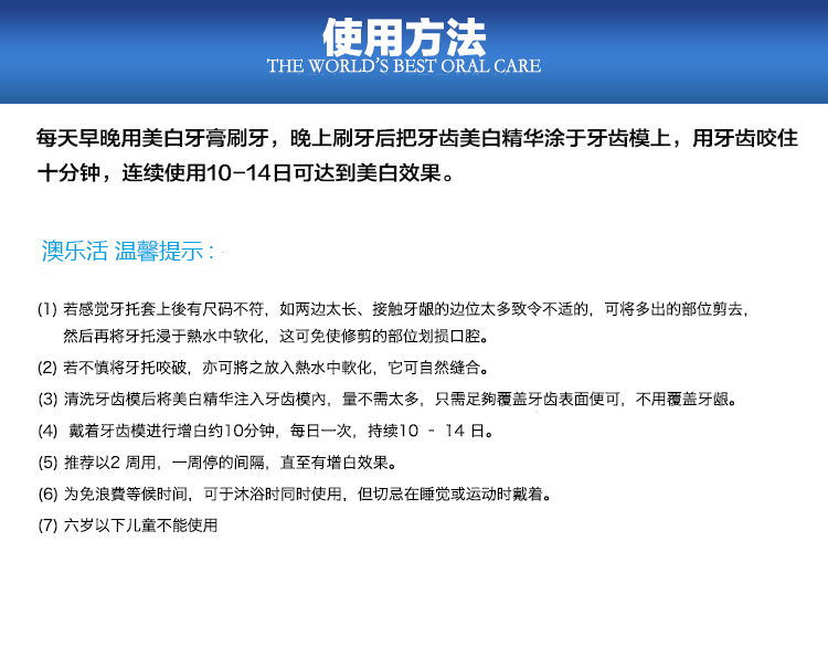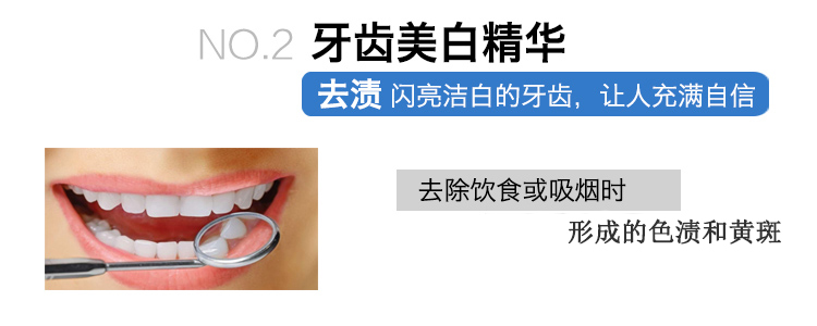 | 使用方法 | 每天早晚用美白牙膏刷牙,晚上刷牙后把牙齿美白精华涂于牙齿模上,用牙齿咬住十分钟,连续使用10-14日可达到美白效果。 |